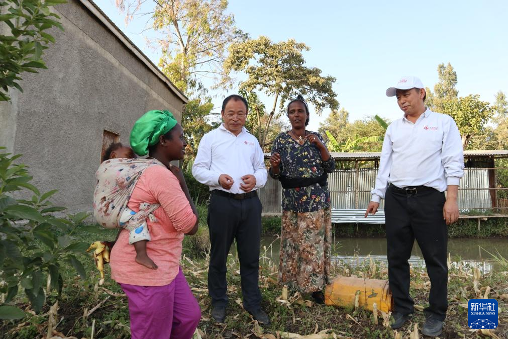 11月26日,在埃塞俄比亚奥罗米亚州的戈迪诺村,中国援埃塞俄比亚第四期高级农业专家组组长张世洪(右一)与当地村民交流。新华社记者 刘方强 摄