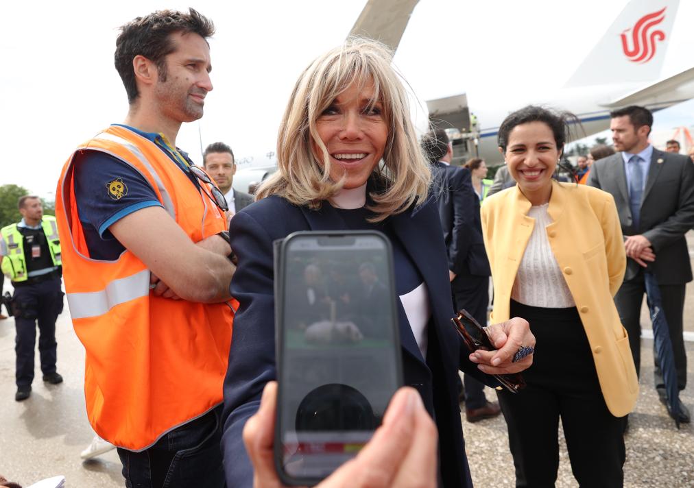 2023年7月25日,在法国巴黎戴高乐机场,法国总统夫人布丽吉特·马克龙用手机展示她与大熊猫“圆梦”的合影。新华社记者 高静 摄