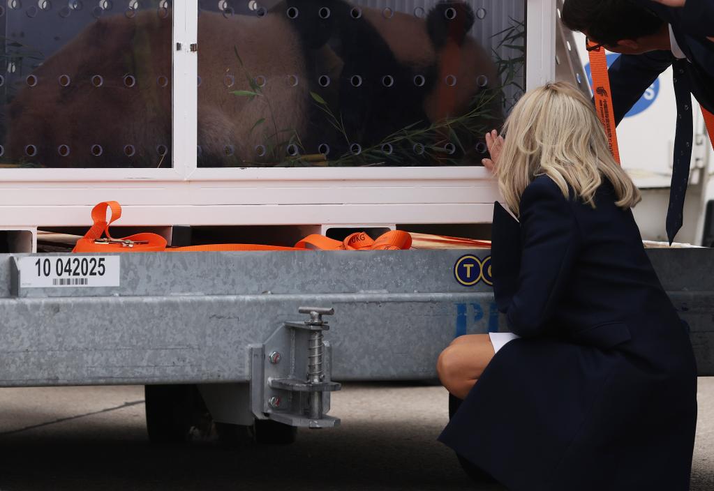 2023年7月25日,在法国巴黎戴高乐机场,法国总统夫人布丽吉特·马克龙为大熊猫“圆梦”送行。新华社记者 高静 摄