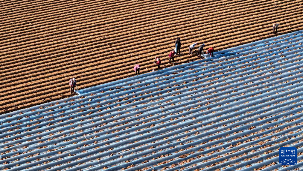 12月6日,在山东省临沂市平邑县临涧镇,农民为蔬菜幼苗覆盖保温薄膜(无人机照片)。