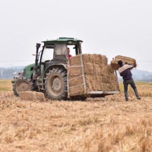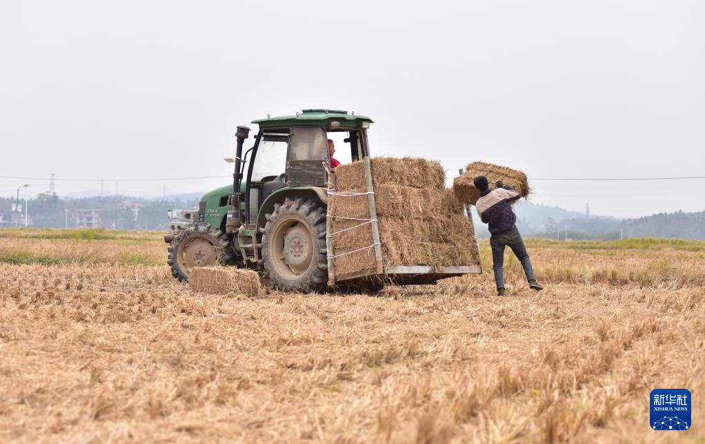 12月5日,广西壮族自治区贺州市平桂区道西村农民驾驶拖拉机打包回收稻田秸秆。