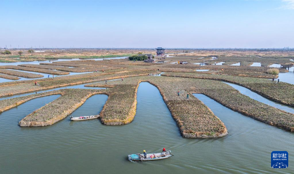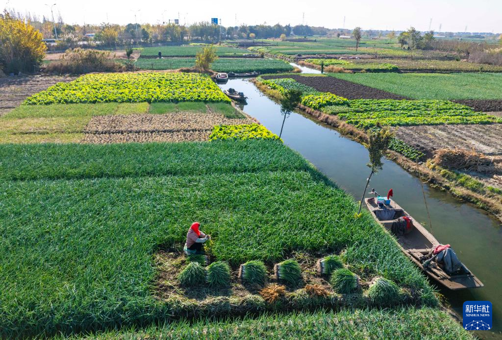 12月6日,农民在江苏省兴化市垛田街道收获香葱(无人机照片)。