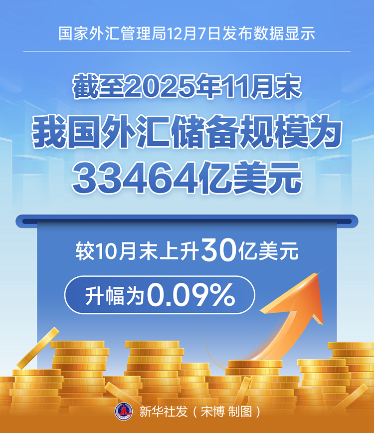 国家外汇管理局12月7日发布数据显示,截至2025年11月末,我国外汇储备规模为33464亿美元,较10月末上升30亿美元,升幅为0.09%。(记者刘开雄)