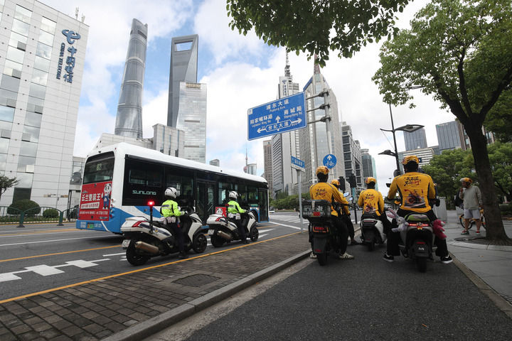 7月20日,在上海市浦东新区浦东南路上,外卖骑手在运送快递途中等待红绿灯。新华社发
