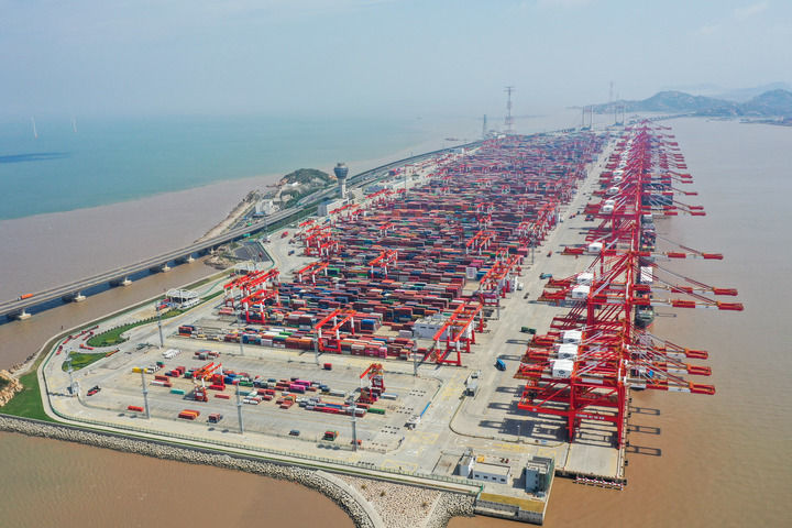 7月26日无人机拍摄的上海洋山港集装箱码头。杨帆摄