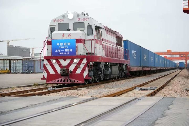 11月20日,一列满载商品的中欧班列从上海铁路物流中心闵行货场驶出。