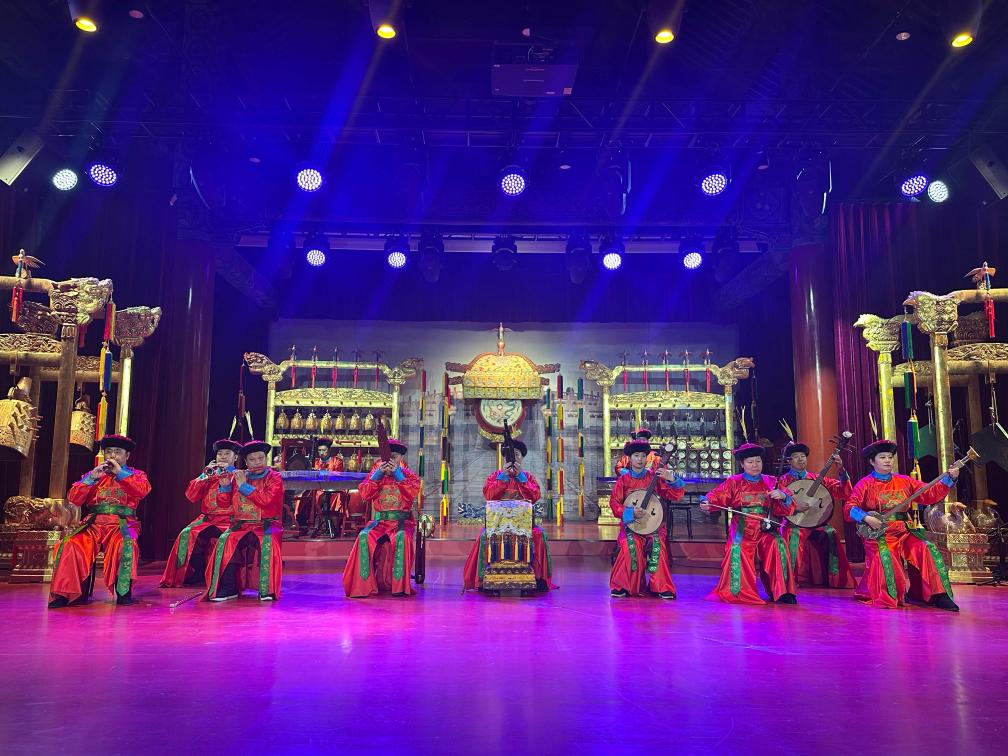 “迎神,乐奏,中和之曲……”在北京天坛公园神乐署,随着“唱乐官”一声吟唱,编钟清鸣,舞台上身着古代宫廷服饰的乐师们执起排箫、笙等乐器,庄重的中和韶乐在沧桑古建中奏响。
