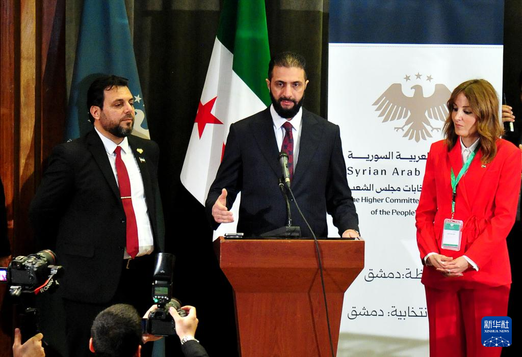 10月5日,在叙利亚首都大马士革,叙过渡政府领导人艾哈迈德·沙拉(中)出现在立法机构选举投票现场(资料照片)。新华社发(阿马尔·萨法尔贾拉尼摄)