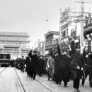 北平学生高呼“反对华北自治,争取民族解放”等口号向天桥集合(资料照片)。