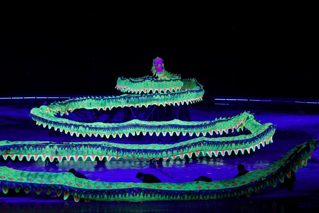 这是12月6日在铜梁区玄天湖龙舞广场拍摄的《追梦·铜梁龙》演出现场。《追梦·铜梁龙》融合水云龙、荷花龙、铁花火龙等多样龙舞。