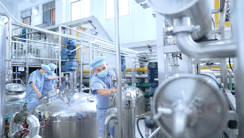 海南华研海口生产基地的生物多肽生产车间内,工人正在操作自主设备进行鱼胶原蛋白肽生产。(邢堂 摄)
