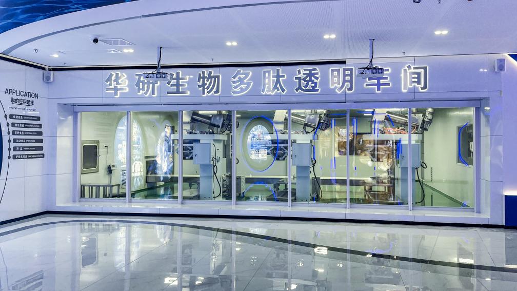 海南华研生物多肽透明车间,透过玻璃可直观看到自动化生产设备。(邢堂 摄)