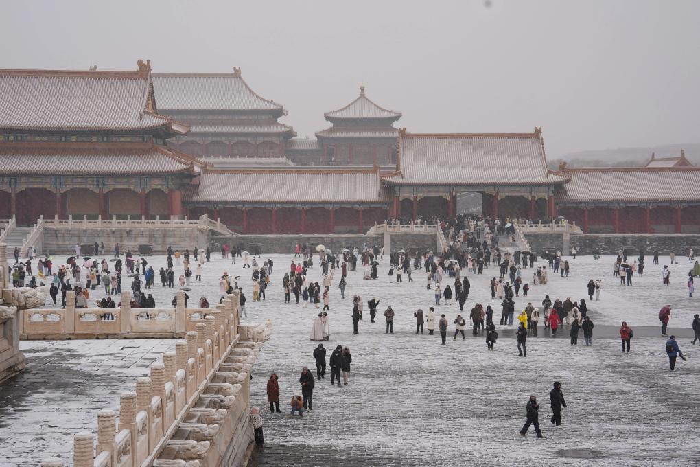 12月12日,游客在故宫赏雪游览。新华社记者 鞠焕宗 摄