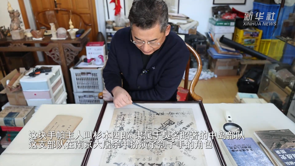 另一件文物是一块手帕,手帕的主人叫杉本四郎,隶属于臭名昭著的中岛部队,这支部队在南京大屠杀中扮演了刽子手的角色。从手帕右上角的记录显示,由于南京城内中国守军顽强阻击,日军杉野大尉被击毙。