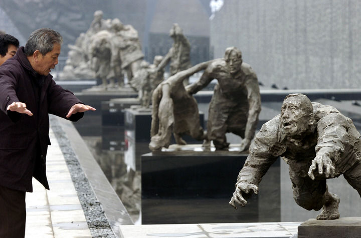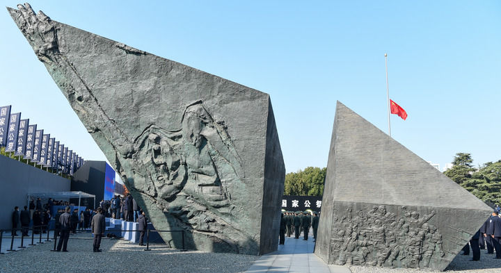 2021年12月13日,南京大屠杀死难者国家公祭仪式在南京举行。图片中央是雕塑《冤魂呐喊》。新华社记者 李博 摄