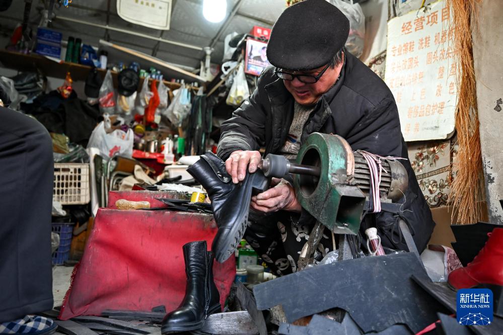 2025年12月9日,修鞋师傅马小平在为顾客修鞋。