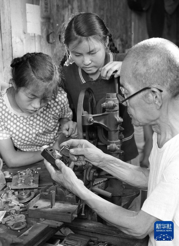 1961年,湖北省武汉市锁钥巧匠郑德华教女儿(左)和侄女学习修锁配钥匙的技术。新华社发