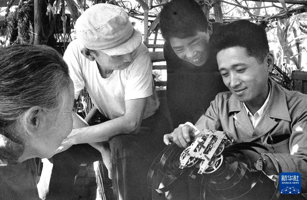 1962年,沈阳市大东区第一钟表合作社工人张秀山(右一)为社员们检修钟表。新华社记者 崔宝林 摄