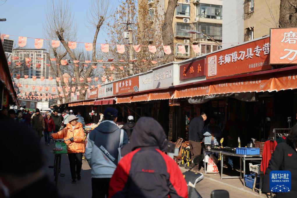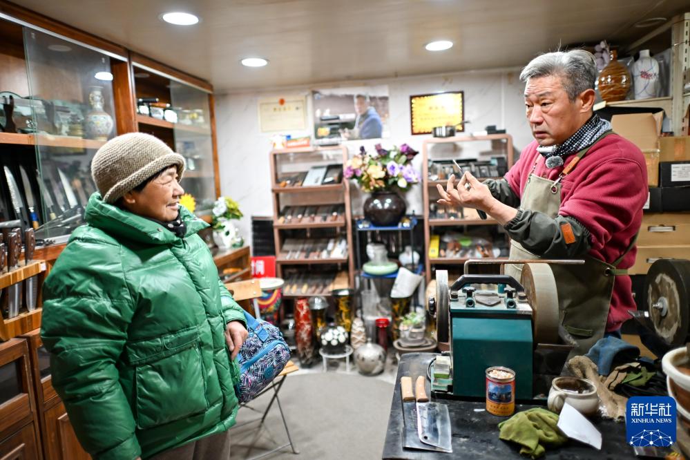 2025年12月9日,磨刀师傅李波(右)在为顾客介绍刀具。