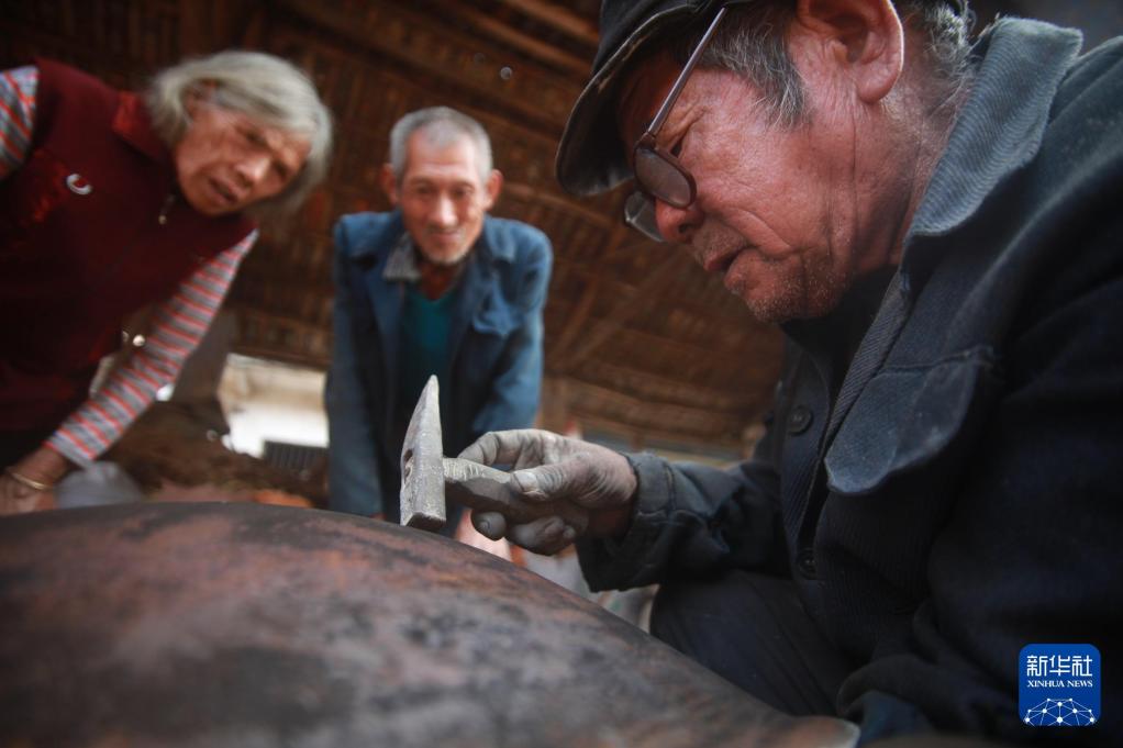 2011年11月13日,广西全州县石塘镇的补锅匠蒋德济在修补一只旧铁锅。新华社发(王滋创 摄)
