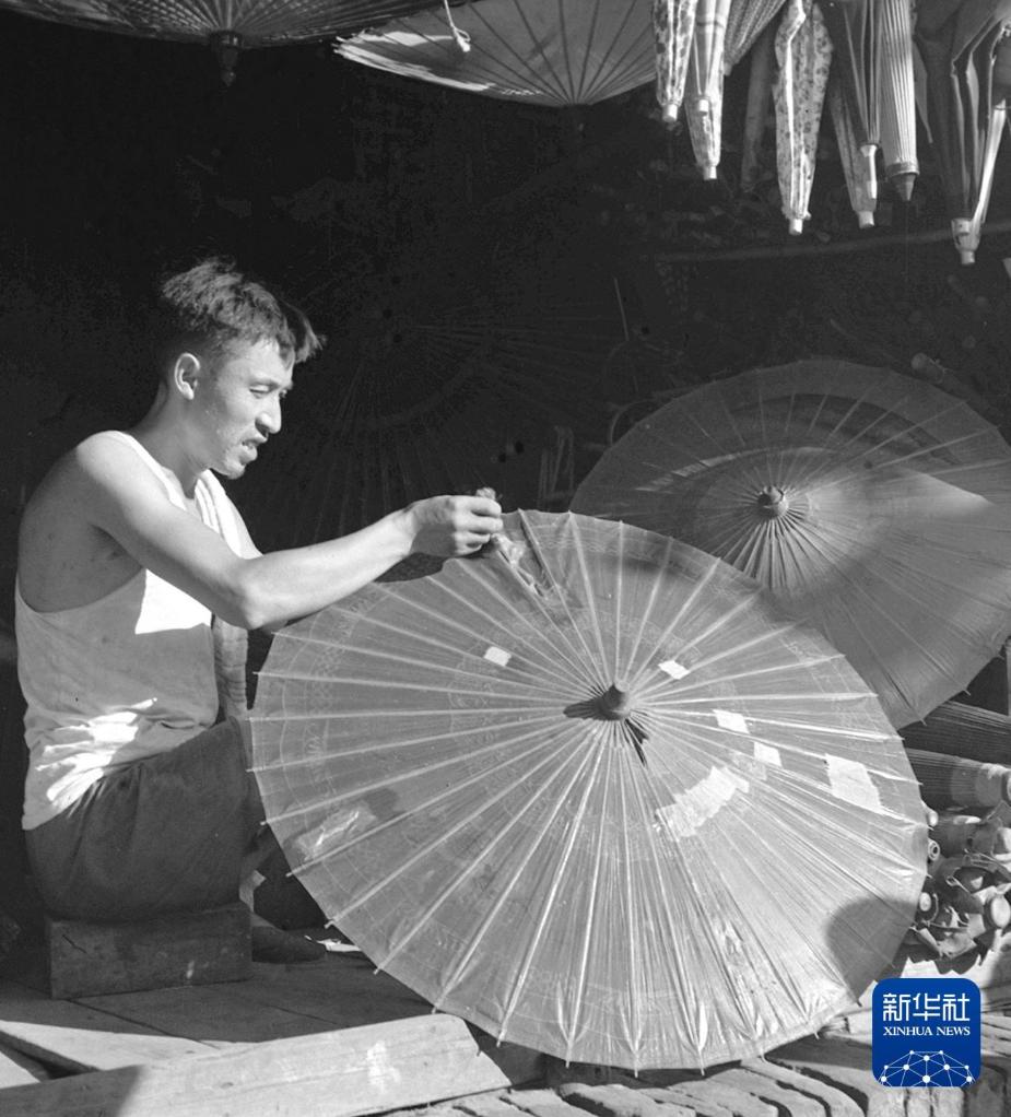 1960年,江苏南京古楼人民公社山西路修伞组工人为顾客修伞。新华社记者 朱冰菊 摄