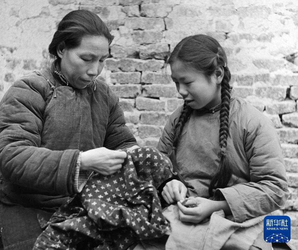 1958年,湖北孝感朋兴乡和平二社的一名妇女(左)教女儿缝衣服。新华社记者 郝纯一 摄