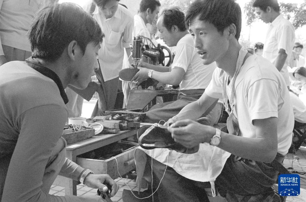 1982年,北京市东城区综合修理加工厂修鞋工为顾客修鞋。新华社记者 郑书福 摄