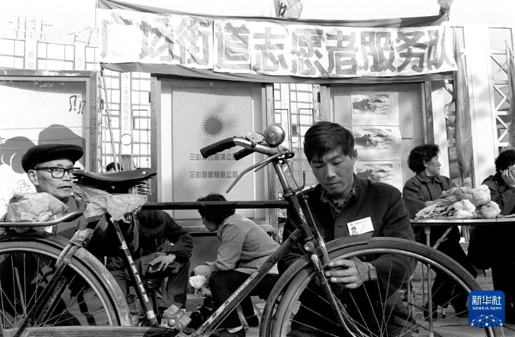 1996年,上海市黄浦区一位志愿服务队员在为居民修自行车。新华社记者 张平 摄