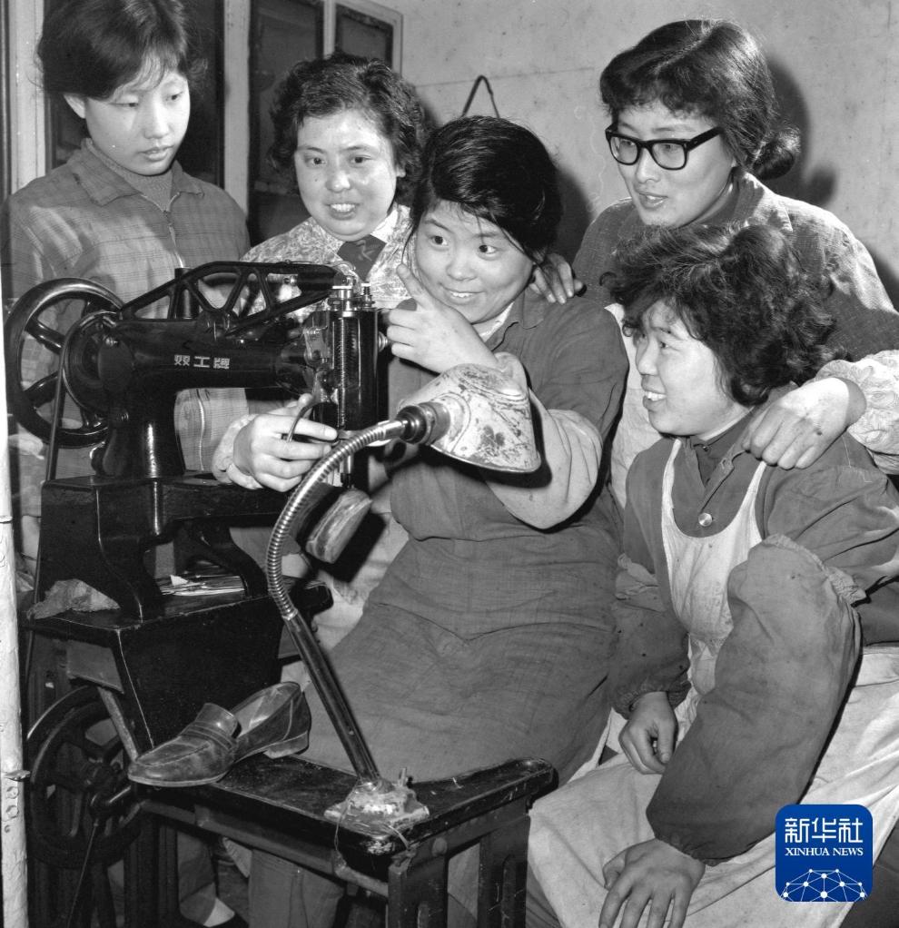 1980年,天津市南开区东马路修鞋门市部由共青团员和青年组成的“五姐妹”修鞋小分队一起交流修鞋经验。新华社记者 杨宝坤 摄