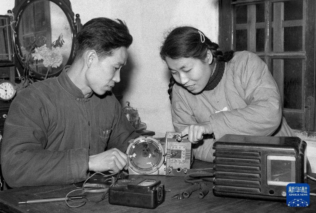 1960年,上海市徐汇区现代无线电行一名职工(左)为居民检修收音机,并向她讲解保养知识。新华社记者 霍生联 摄