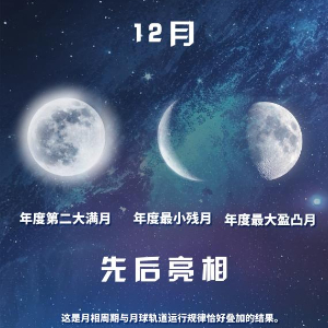 细心的公众不难发现,12月5日,也被称为“超级月亮”的本年度第二大满月刚刚出现;而就在年度最小残月现身后的15天,本年度最大盈凸月也将于31日亮相天宇。缘何在不到30天内,月亮会经历“大小大”式“变脸”?