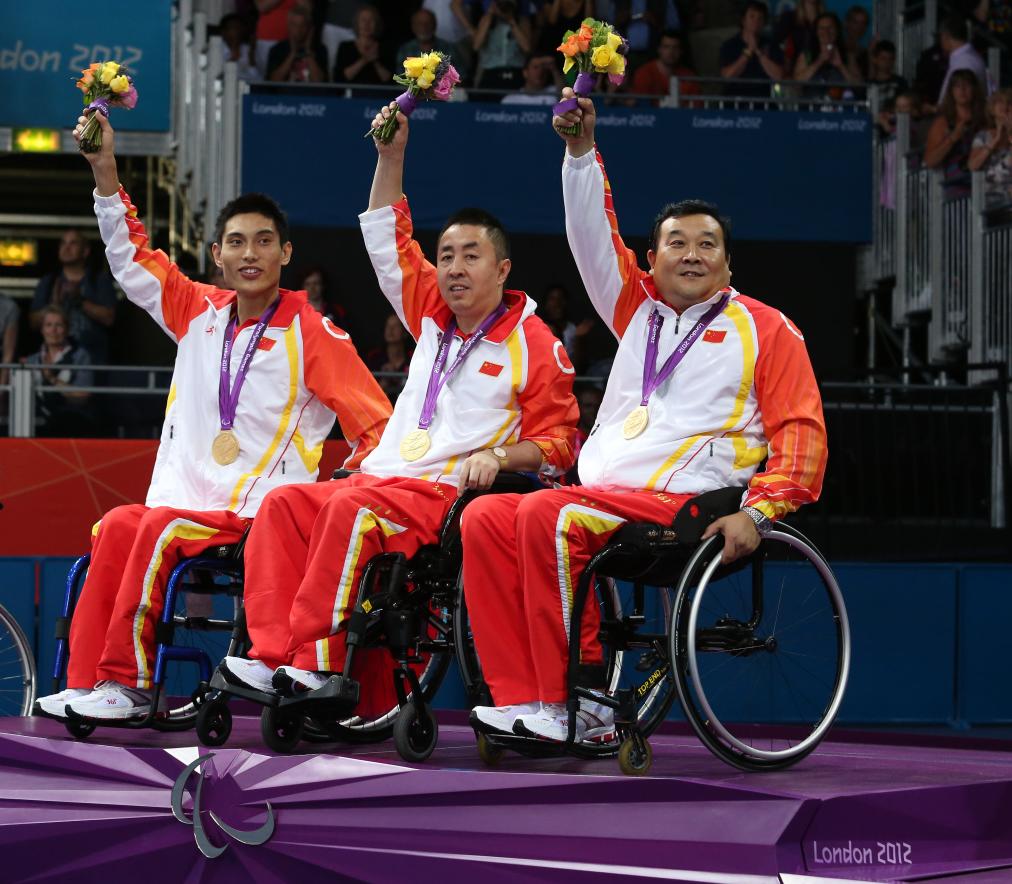 2012年9月7日,在伦敦残奥会乒乓球男子团体3级决赛中,中国队以3:2战胜德国队,获得冠军。图为中国选手冯攀峰、高延明和赵平(从左至右)在颁奖仪式上。新华社记者 白雪飞 摄