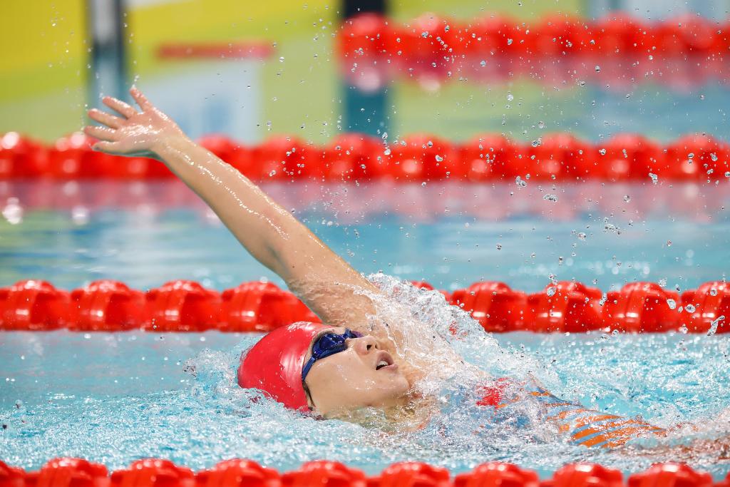 12月10日,山东队选手彭惠迪在女子100米仰泳S15级决赛中,最终,她获得冠军。新华社记者 梁旭 摄