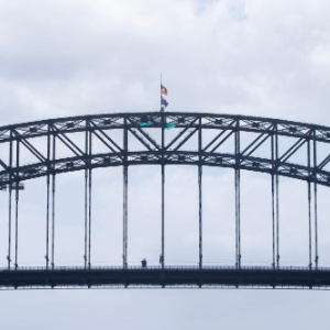 12月15日,澳大利亚悉尼的海港大桥降半旗悼念邦迪滩枪击事件遇难者。新华社记者 马平 摄