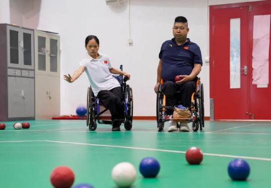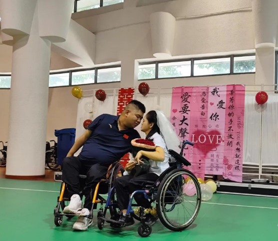 广东队郑远森与广越楚,是一对在赛场与生活中并肩前行的伴侣。患有肌无力的郑远森是硬地滚球BC4级运动员,患有脑瘫的广越楚则在BC2级别征战,两位运动员日常行动都需要借助轮椅。再过几天,就是两人领证结婚一周年的纪念日了。