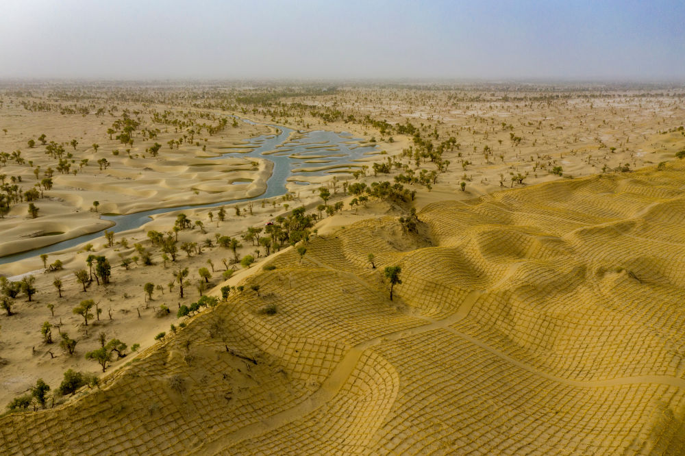 如今,站在塔里木河畔,绵延的胡杨林、草方格与波光粼粼的河面相互映衬。绿锁流沙为当代计,生态安全为万世谋。作为塔克拉玛干沙漠绿色阻沙防护带工程的重要组成部分,塔里木河生态输水工程为塔克拉玛干沙漠增添新绿,打造成沙漠中的“绿色长廊”。
