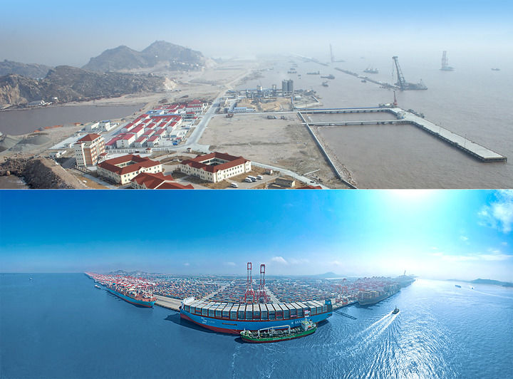 拼版照片:上图为2005年1月16日拍摄的上海洋山港一二期工程(新华社发);下图为2024年4月10日无人机拍摄的上海洋山港(新华社发)。