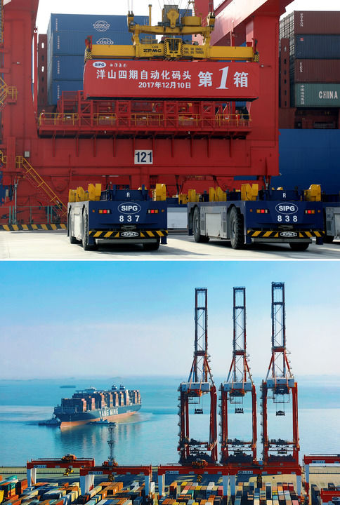 拼版照片:上图为2017年12月10日,上海洋山深水港四期自动化码头开港试生产(新华社发);下图为2025年3月25日拍摄的上海洋山港四期自动化码头(新华社发)。