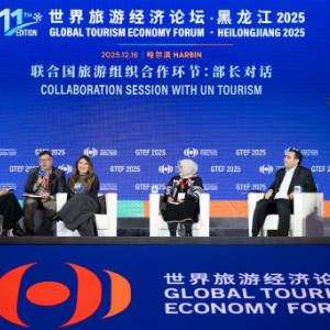 12月16日,在世界旅游经济论坛·黑龙江2025现场拍摄的联合国世界旅游组织合作环节的部长对话。新华社记者 张涛 摄
