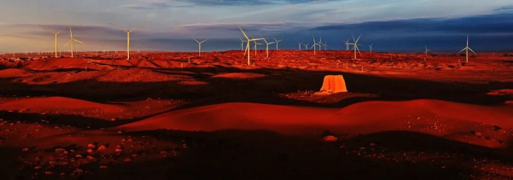 2025年11月16日拍摄于甘肃省张掖市高台县北部滩风电项目基地。红沙漫卷的戈壁上,残旧烽燧静立夕阳里,身后成排风电装置舒展扇叶。@阿正
