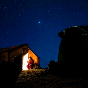 这是今年五一前夕,我和新疆日报记者蔡老师到物探队采访拍下的一张照片。在海拔3000多米的昆仑山巅,夜幕降临,辛苦了一天的钻井机组钻工们回到山顶临时宿营地,孤零零的小帐篷透出温暖的灯光,一名钻工坐在帐篷口吃晚饭,头顶是西昆仑的漫天星河,他们是找油找气的石油人,他们的工作既浪漫又艰辛。@王健