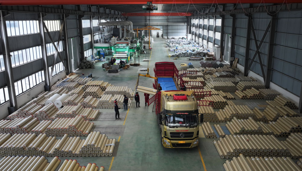 ↑12月12日,工人在四川省广元市一家卷材地板制造车间进行装车作业(无人机照片)。