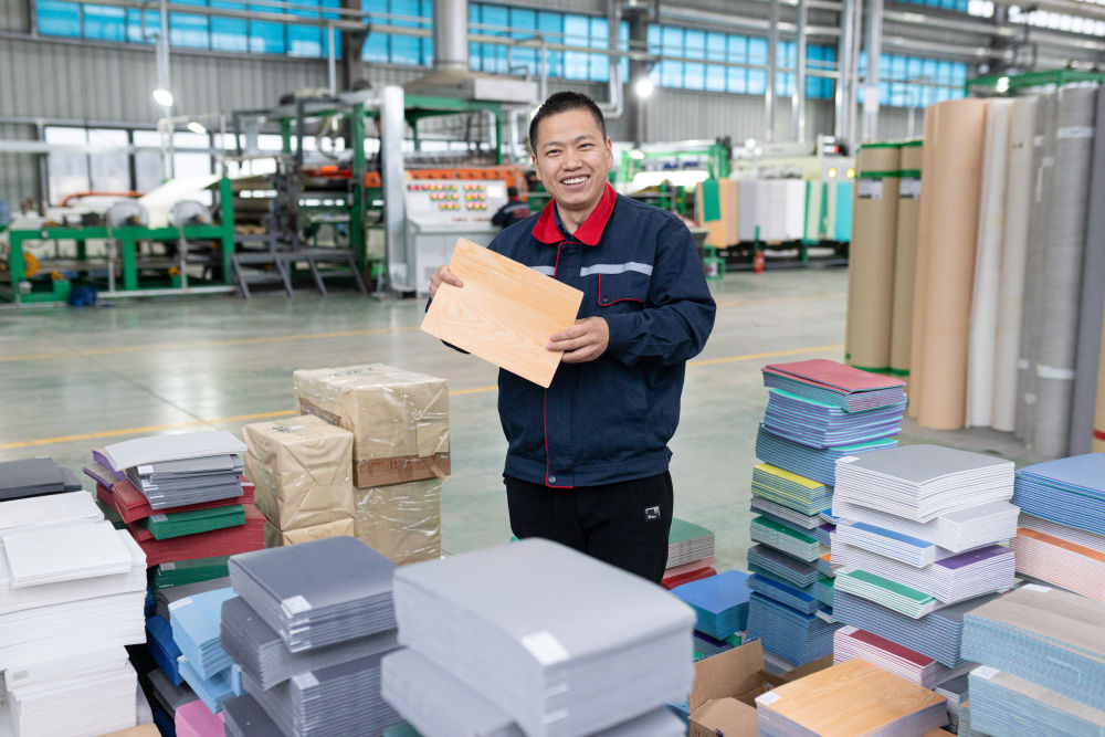 ↑12月12日,工人在四川省广元市一家卷材地板制造车间比对样品颜色。