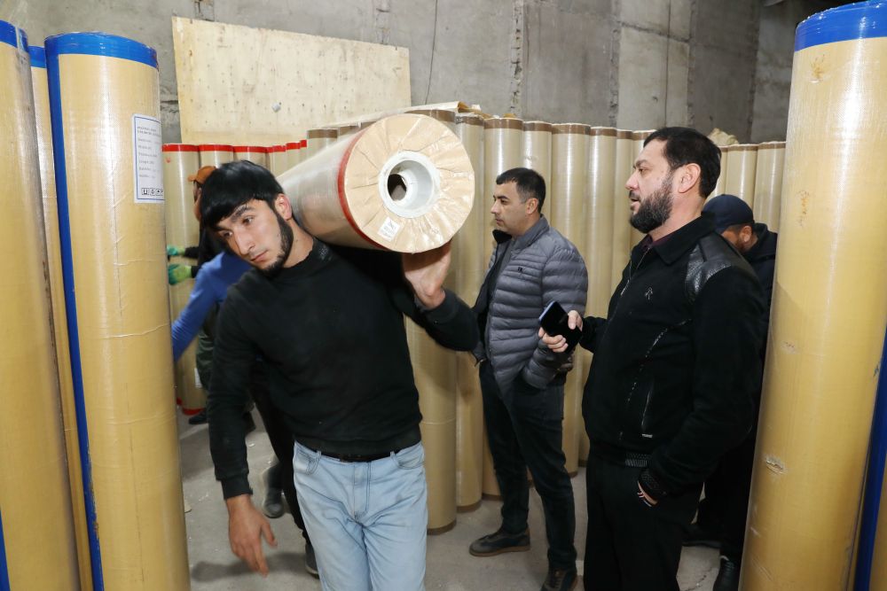 ↑12月12日,在乌兹别克斯坦首都塔什干,当地商家塔什普拉托夫(右)请工人从仓库搬运卷材地板。