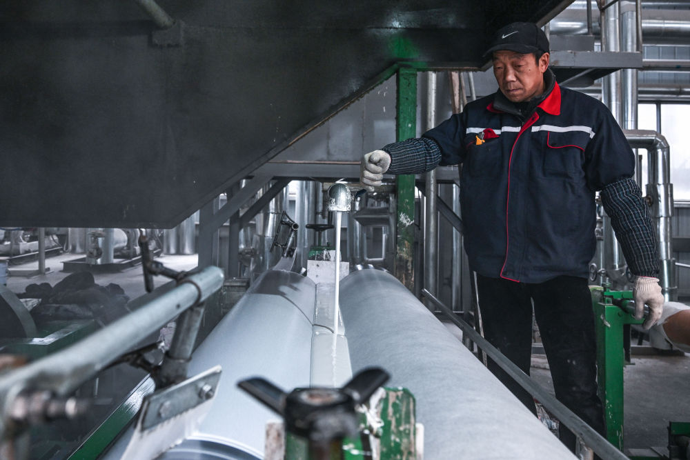 ↑12月12日,工人在四川省广元市一家卷材地板制造车间监控浆液流量。