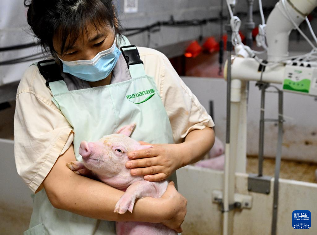 工作人员在内乡牧原肉食产业综合体仔猪段查看仔猪生长情况(8月20日摄)。新华社记者 郝源 摄