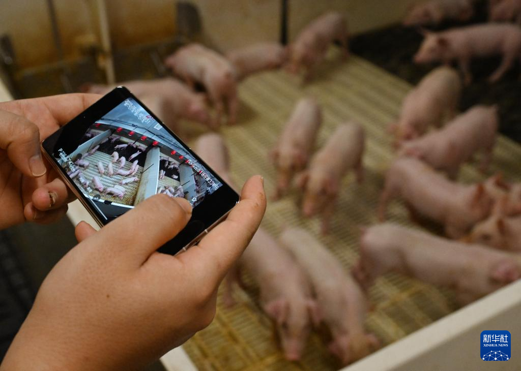 工作人员在内乡牧原肉食产业综合体通过手机查看仔猪段猪舍单元(8月20日摄)。新华社记者 郝源 摄