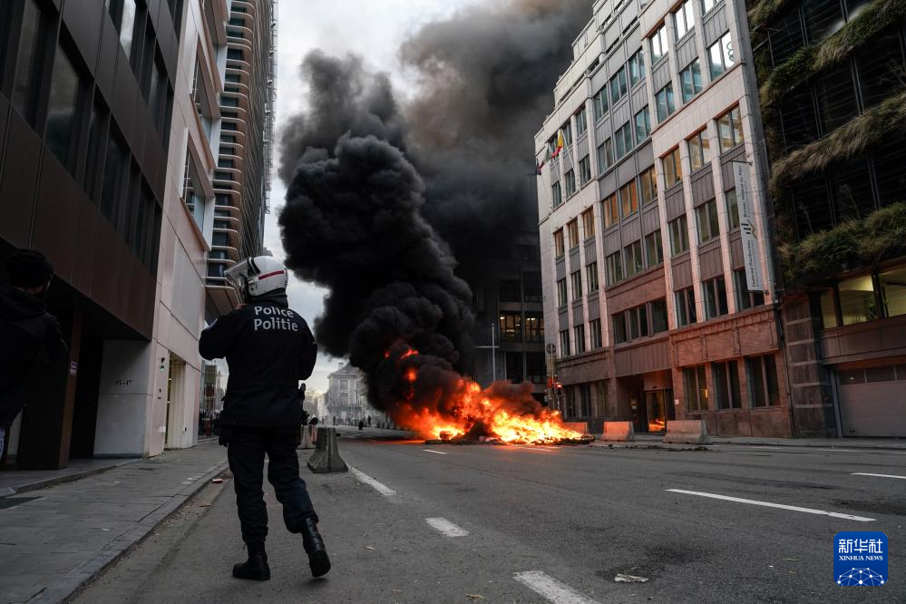 12月18日,在比利时布鲁塞尔,示威者在街道上点燃干草堆和废旧轮胎。新华社记者 彭子洋 摄