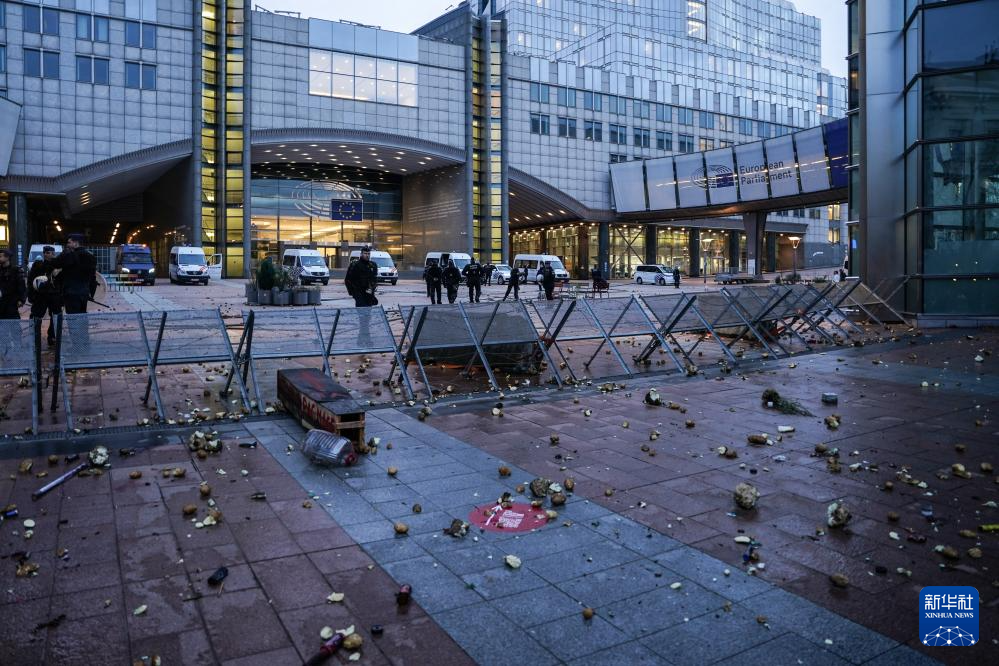 这是12月18日在比利时布鲁塞尔拍摄的示威者投掷的土豆。新华社记者 彭子洋 摄