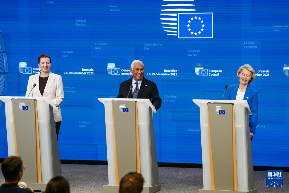 12月19日凌晨,在比利时布鲁塞尔,欧洲理事会主席科斯塔(中)、欧盟委员会主席冯德莱恩(右)、丹麦首相弗雷泽里克森出席新闻发布会。新华社记者 彭子洋 摄